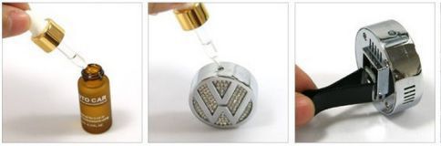 В комплекте идёт бутылочка с ароматизатором, из которой можно снова и снова заправлять подвеску. Можно менять ароматы, можно использовать аромамасла или любимые духи.