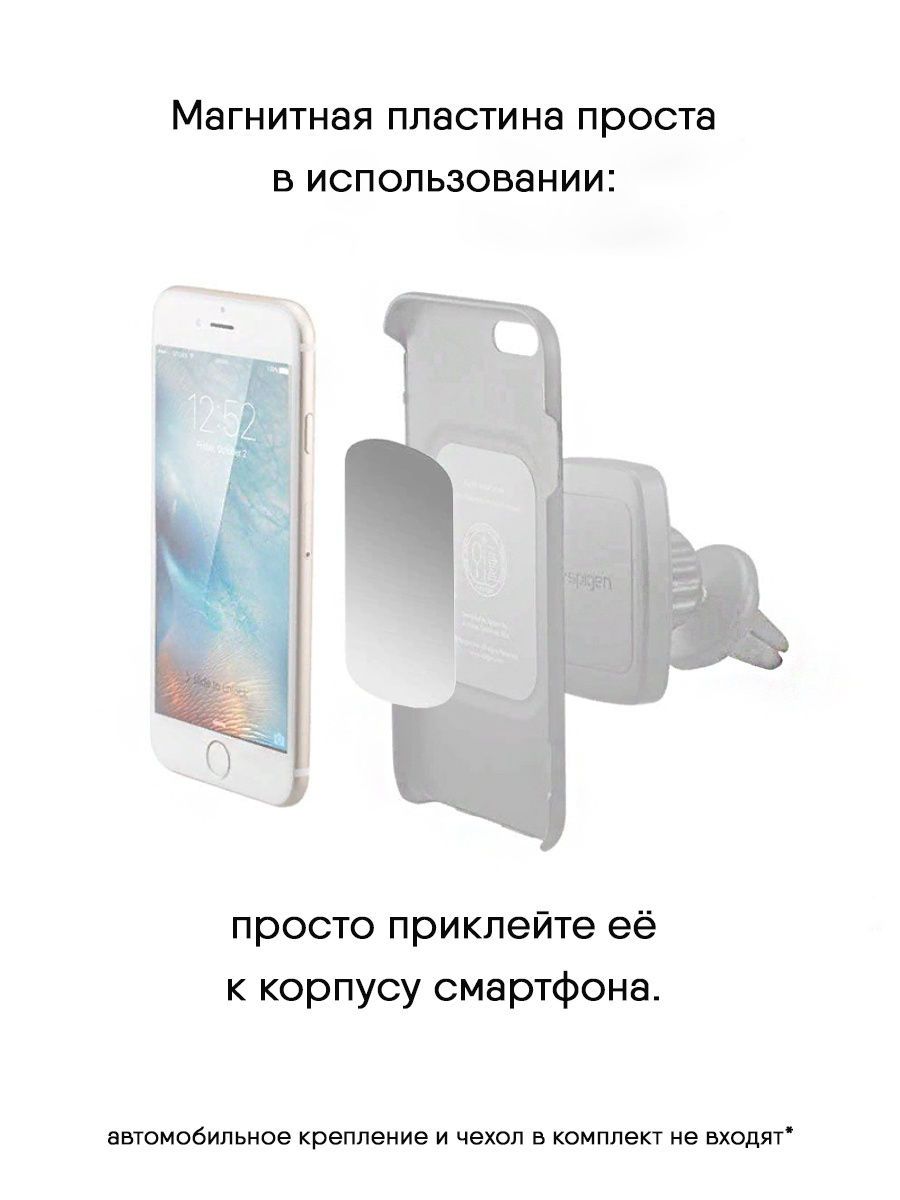Держатель устанавливается на решетку вентиляции. На корпус телефона наклеивается металлическая пластина, которая идёт в комплекте, либо её можно положить под чехол. В корпус магнитного автомобильного держателя встроен сильный магнит, который не оказывает влияния на закреплённое устройство, но надёжно удерживает его. Встроенный шарнир позволяет закрепить устройство в любом удобном для Вас положении и под любым углом. Вы можете зафиксировать и снять устройство из держателя одной рукой в одно касание.