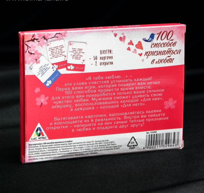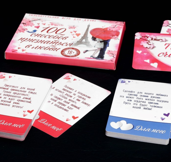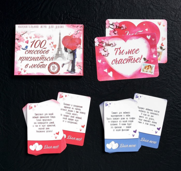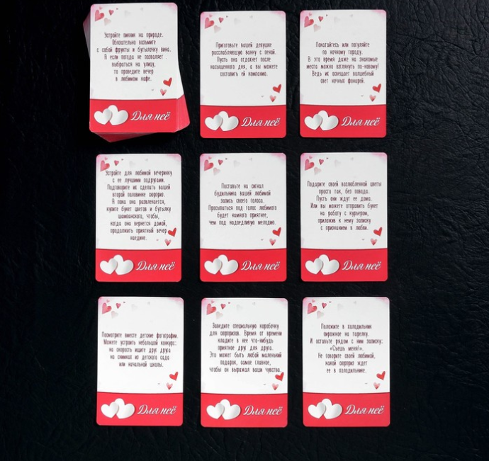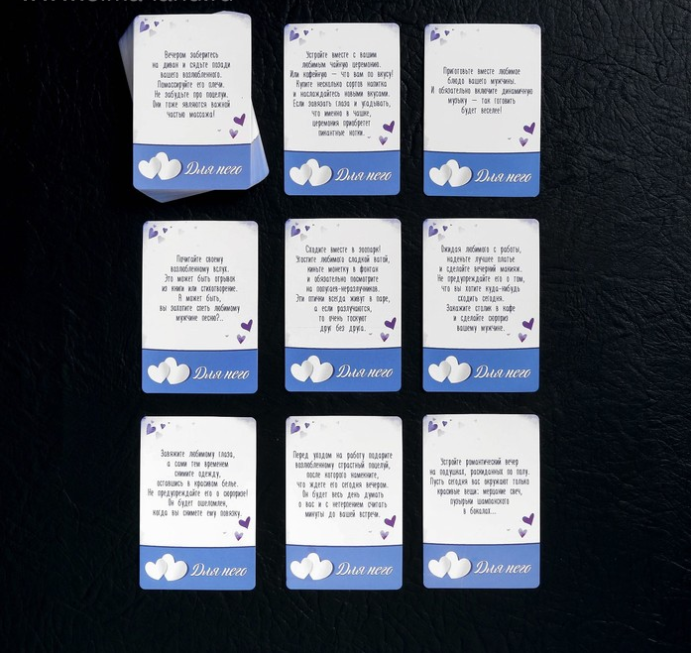 Мужчина сможет удивить свою половинку, воспользовавшись колодой «Для неё», а она — «Для него». Вытягивайте карточки, вдохновляйтесь идеями и воплощайте их в реальность. Внутри вы найдёте открытки, напишите на них самые тёплые признания и преподнесите друг другу!