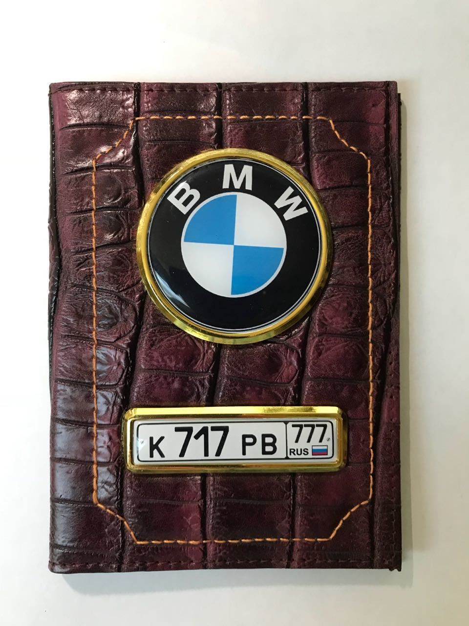 - Кожаная обложка «КРОКОДИЛ» на автодокументы с металлическими вставками «под серебро и золото».