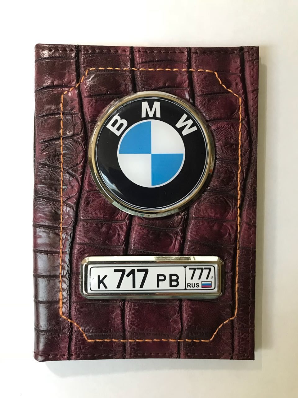 Обложки сделаны из натуральной кожи. Заготовки обложек имеют специальные металлические вставки с бортиками, которые не темнеют и не облезают. Благодаря этим бортикам изображение защищено от механических воздействий, а полиуретановая линза защищает картинку от выгорания и стирания.Изготовление кожаной обложки занимает 5 минут и не требует специального оборудования. Макет для обложки распечатывается на цветном струйном принтере на самоклеющейся фотобумаге, далее к распечатанному изображению приклеивается линза, вся эта «конструкция» вырезается ножницами и убрав защитный слой с самоклейки, вклеивается в металлическую вставку с бортиками. Эксклюзивная обложка для авто документов с гос. номером авто и логотипом готова!