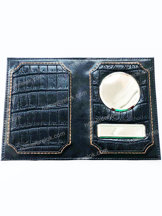 Обложки сделаны из кожи. Заготовки обложек имеют специальные металлические вставки с бортиками, которые не темнеют и не облезают. Благодаря этим бортикам изображение защищено от механических воздействий, а полиуретановая линза защищает картинку от выгорания и стирания.