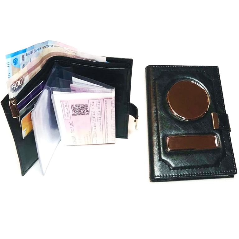 Кожа: МАТОВАЯ. Цвет: ЧЁРНЫЙ. Прошивка: ЧЁРНАЯ. Обложка 4в1 на заклёпке. Автодокументы + отделения для карт и визиток + кошелёк на молнии + карман для купюр. Вставки: ЧЁРНЫЕ