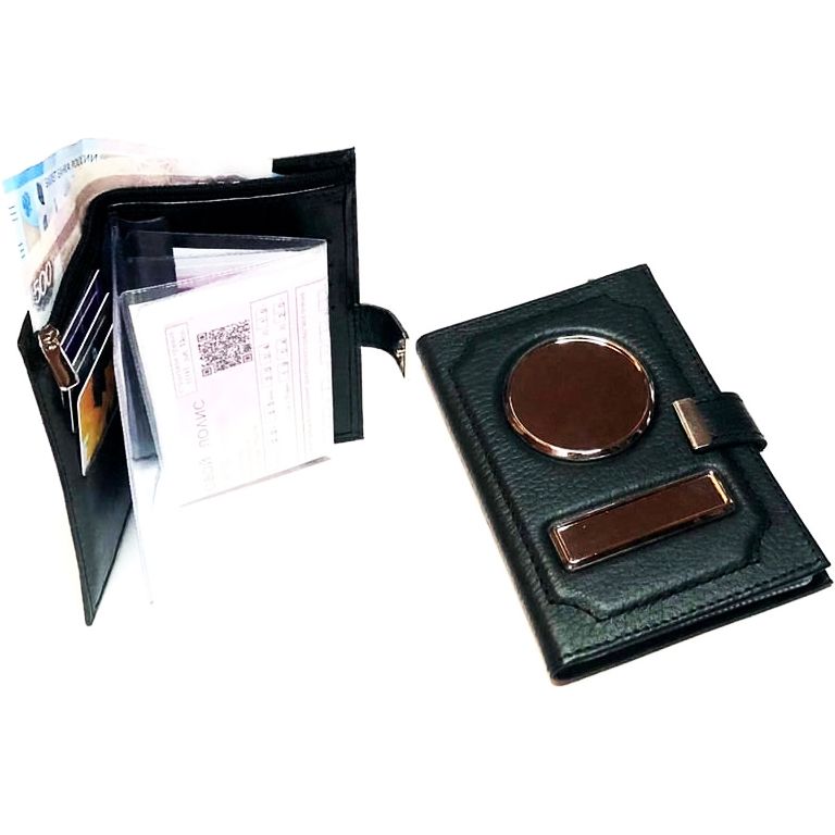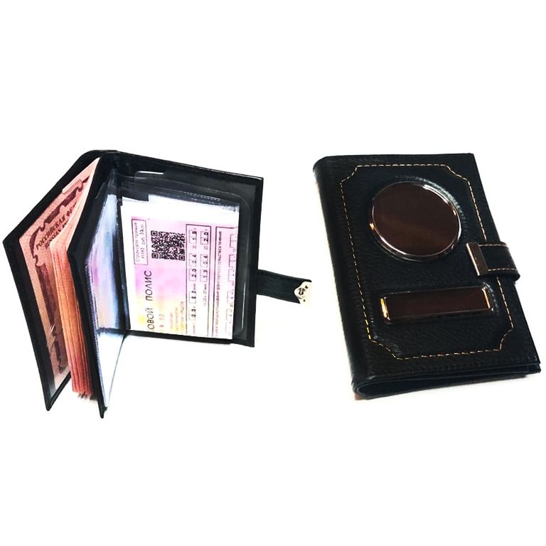 Кожа: ЗЕРНИСТАЯ. Цвет: ЧЁРНЫЙ. Обложка 4в1 на заклёпке. Автодокументы + отделения для карт и визиток + кошелёк на молнии + карман для купюр. Вставки: СЕРЕБРО