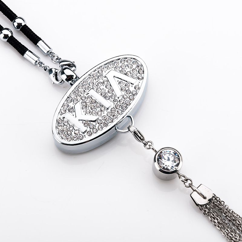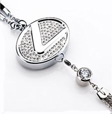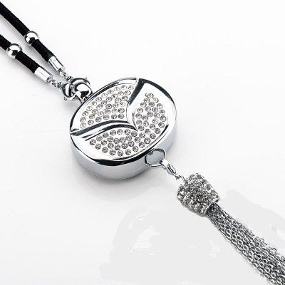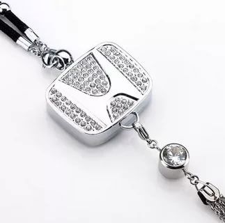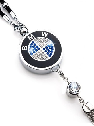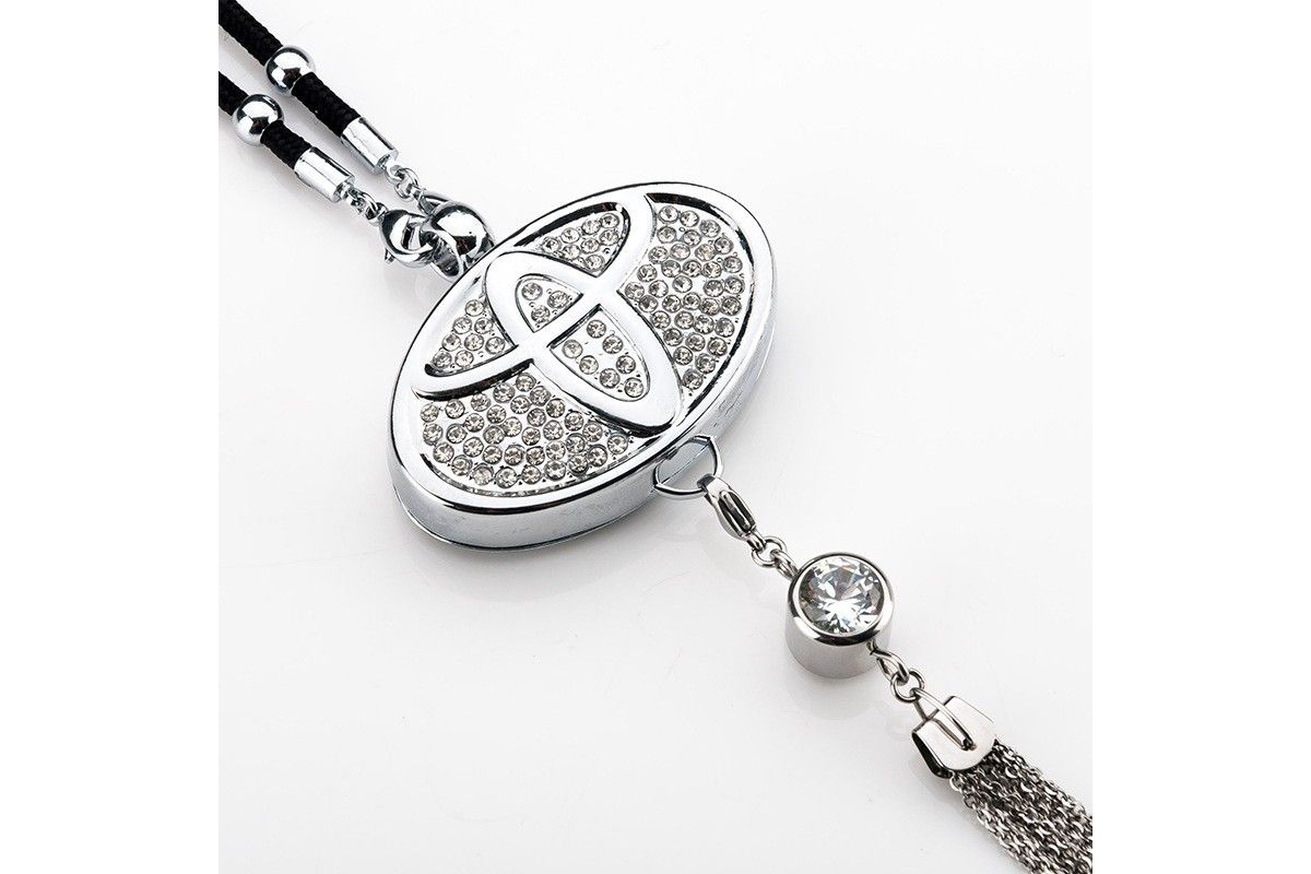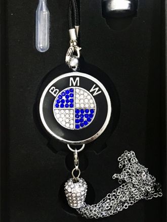 Подвеска сделана из металла, инкрустирована стразами и цепочками. Крепится на зеркало заднего вида.