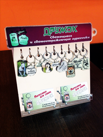 Рекламная стойка-визитница для размещения визиток и образцов брелоков.